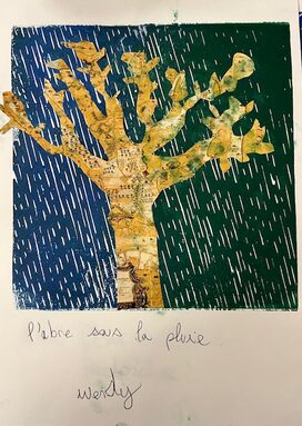 Chaque élève de la classe de 6ème 6 a pu découvrir la technique de la gravure en créant une carte personnelle combinant une plaque de linoléum gravée et des formes découpées selon son imagination.