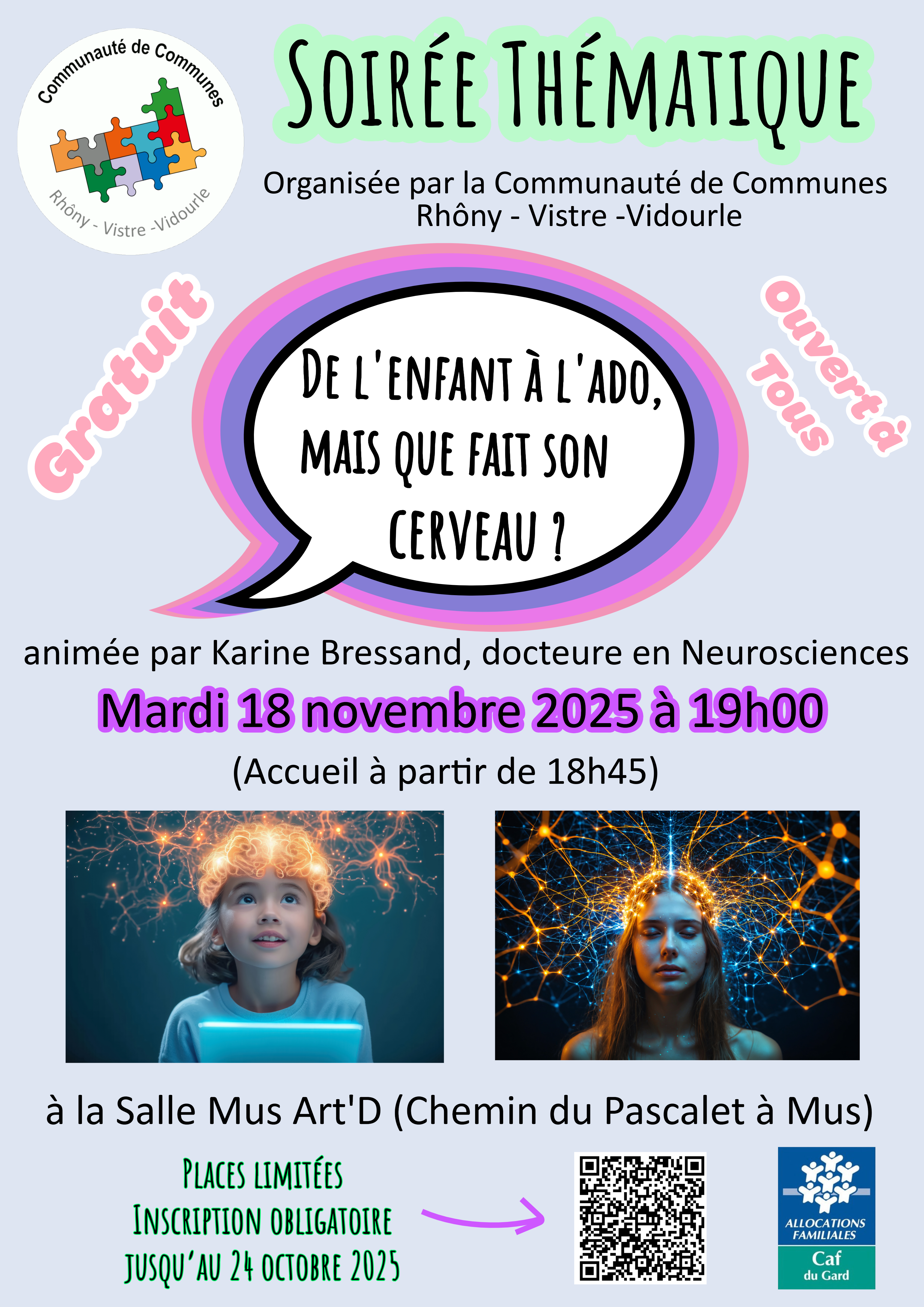 Animée par Karine BRESSAND Docteure en Neurosciences, cette soirée sur le thème « De l'enfant à l'ado, mais que fait son cerveau ? » est gratuite et ouverte à tous les parents du territoire.